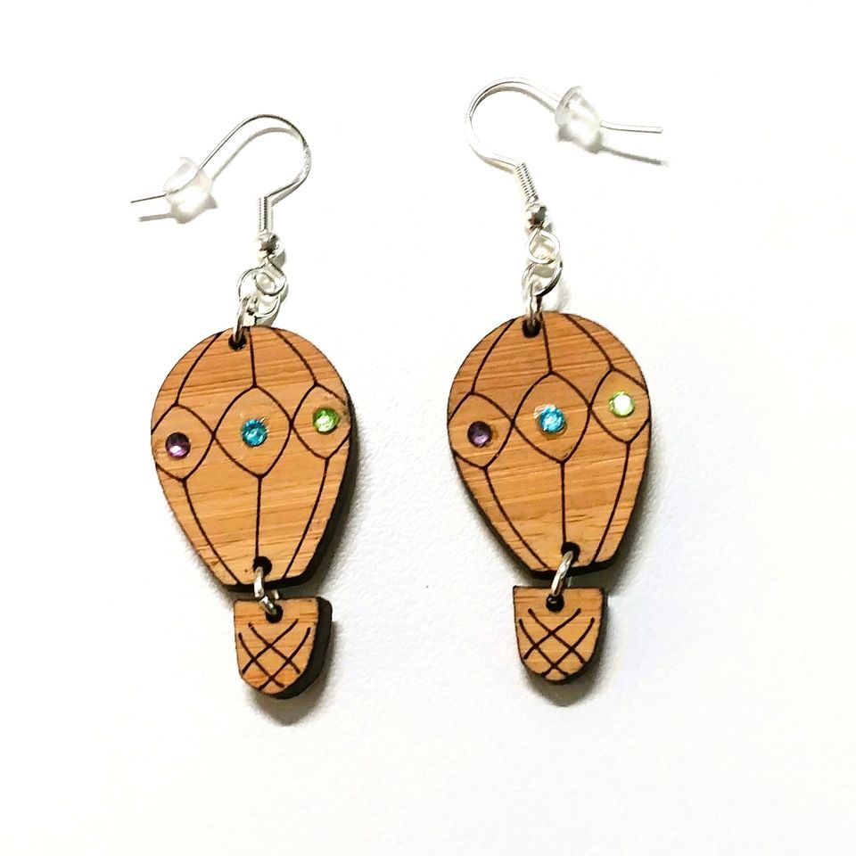 Laser Cut Hot Air Balloon Wooden Earrings Handcrafted with rhinestones.